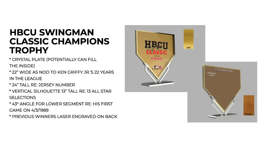 My goal was to design a trophy that felt fresh, timeless, and iconic for the foundation. We started by deconstructing the game’s logo and studying the rich history of HBCUs, finding ways to blend both narratives through creative storytelling. The final championship trophy took the shape of home plate, with its measurements holding hidden symbolic meaning, while the MVP trophy embodied a star—paying tribute to excellence and incorporating the legendary swing of Ken Griffey Jr.